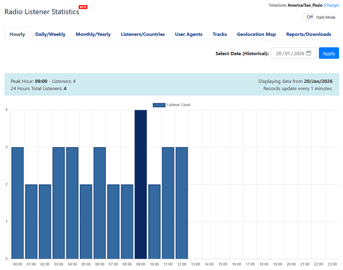 O novo módulo de estatísticas avançadas eleva o nível de análise disponível para o cliente. Agora é possível acompanhar dados de ouvintes de forma detalhada, com visões horárias, diárias, semanais, mensais e anuais, além de acesso ao histórico completo por data.