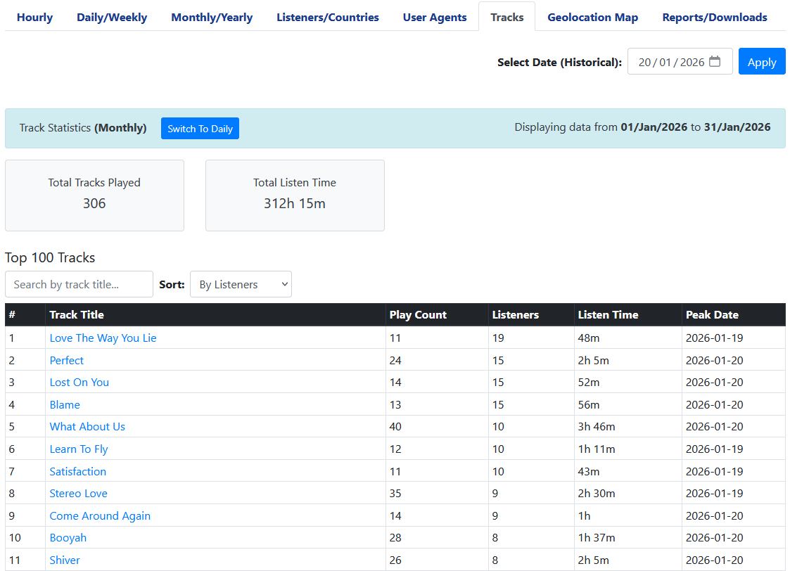 🎼 Estatísticas de faixas tocadas e relatórios profissionais